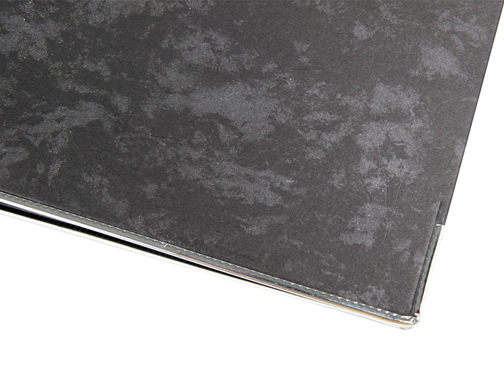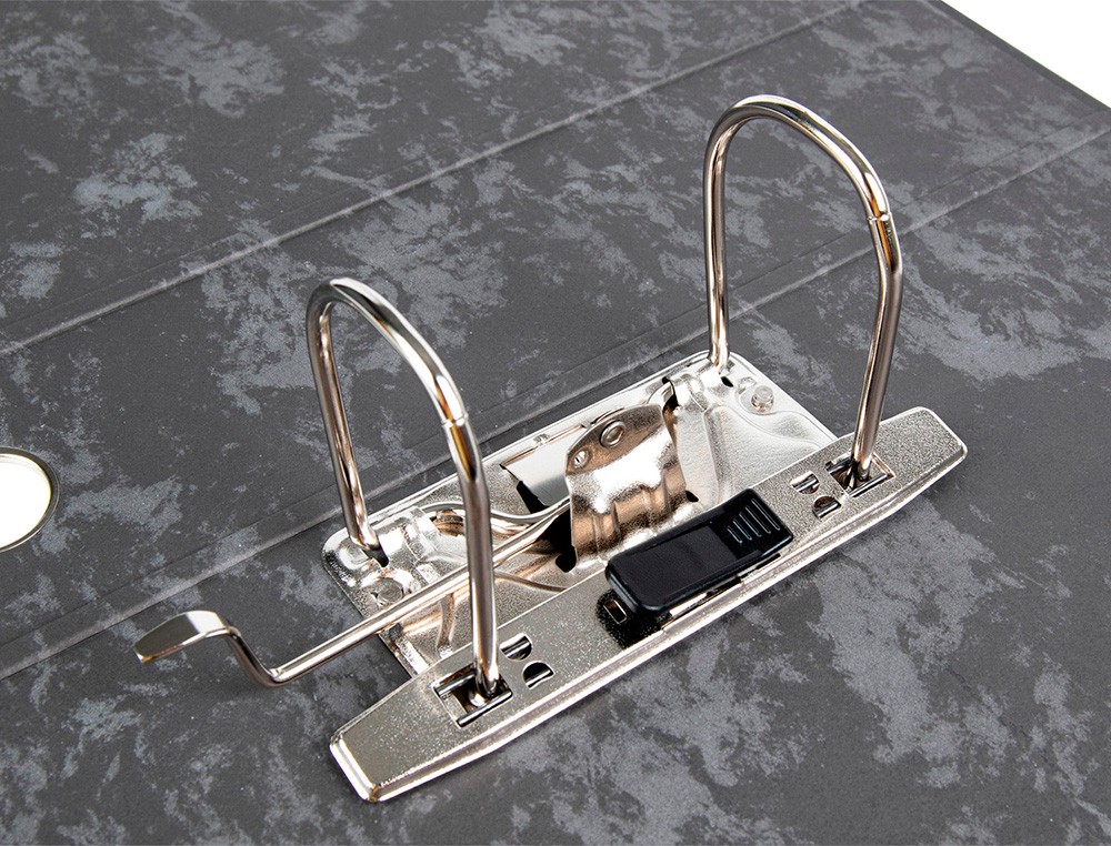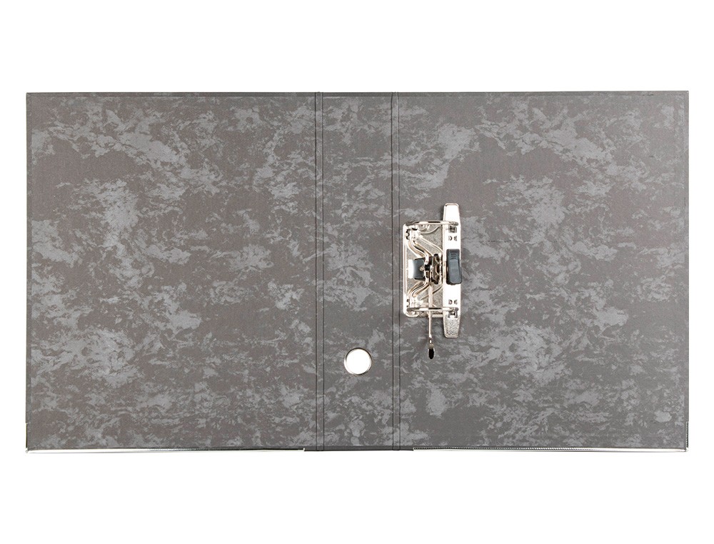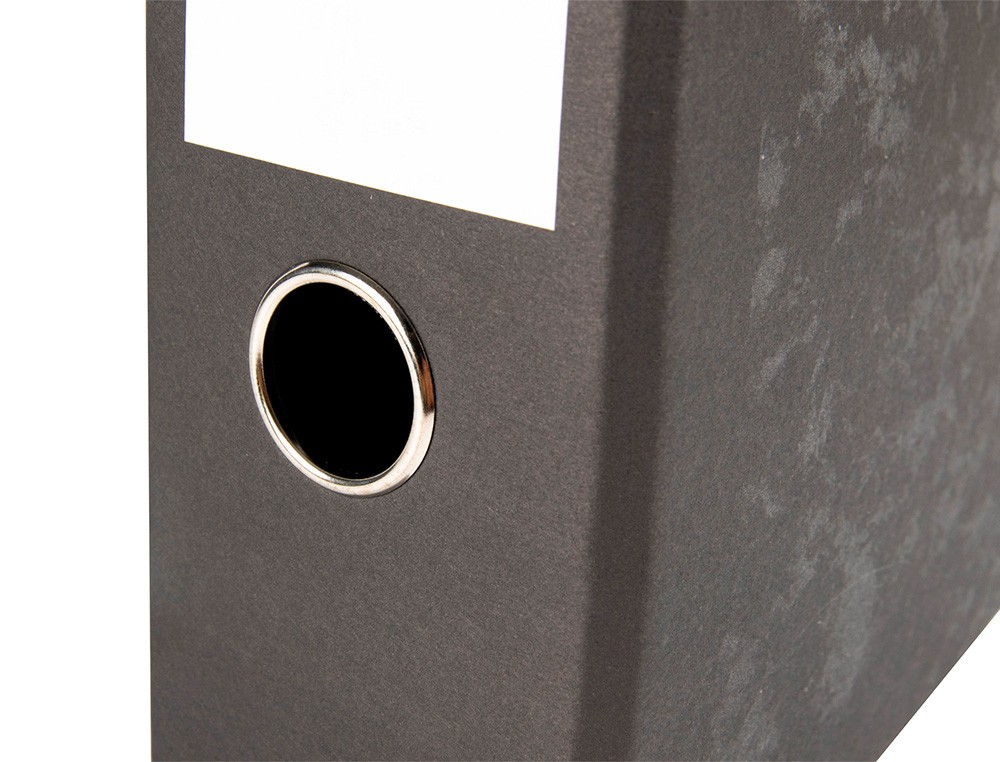 Archivador de cartón de 1,9 mm de espesor forrado. Interior y exterior jaspeado negro. Mecanismo de palanca niquelado de 75 mm. Compresor metálico, ollao y cantoneras largas. Etiqueta impresa. Sin caja. Color negro. Ancho de lomo: 80 mm.