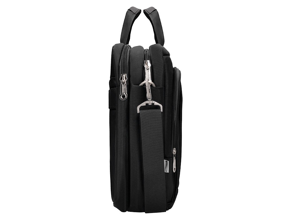 Maletín para portátil, práctico y ligero fabricado en poliéster. Tiene un bolsillo exterior con compartimento para bolígrafos y tres compartimentos interiores. Uno de los compartimentos interiores está acolchado con un cierre de velcro para el portátil. 1 asa de mano. Medidas: 390 x 310 x 120 mm.