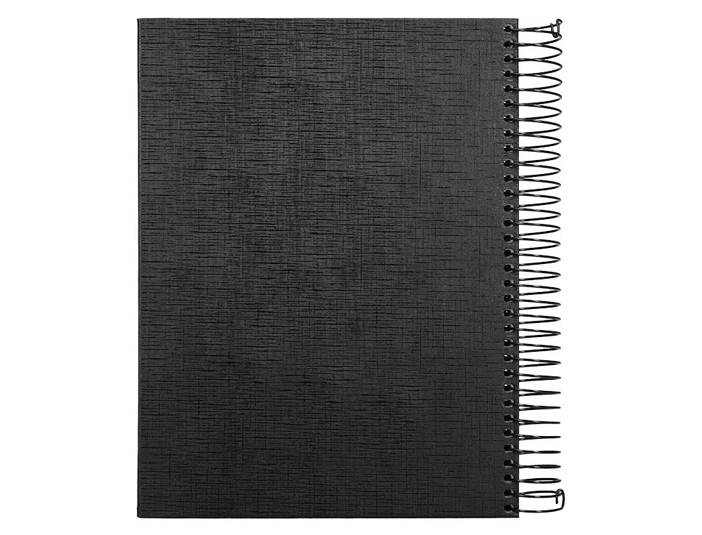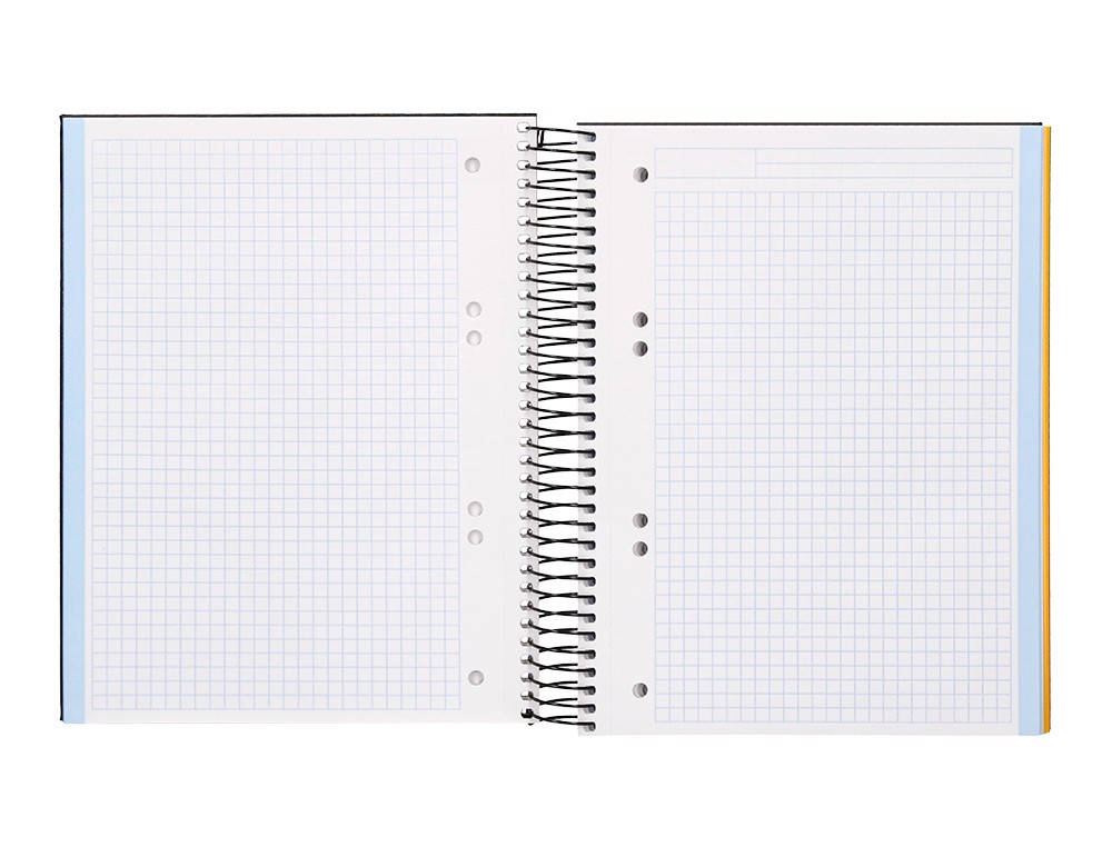 Tapa de cartón entrecolado de 1,50 mm de espesor, forrado con papel de encuadernación plastificado, gofrado tela en PVC. 140 hojas. Papel de 75 g/m². Bandas de 5 colores. Cuadrícula de 5 mm. Guarda interior impresa. Espiral nylonizada negra. Coil-lock.