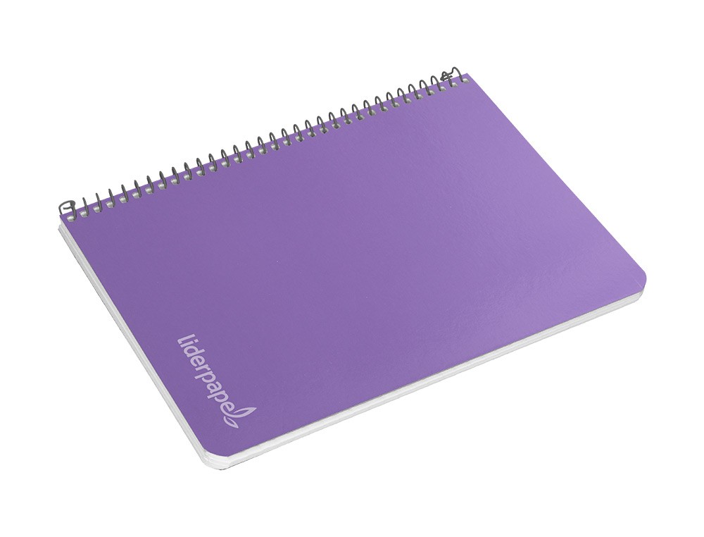 Tapa de cartón de 800 g/m² contracolado, impresa y plastificada mate. Gran resistencia y rigidez. Papel de 75 g/m². Espiral nylonizada. Coil-lock. Colores surtidos.
