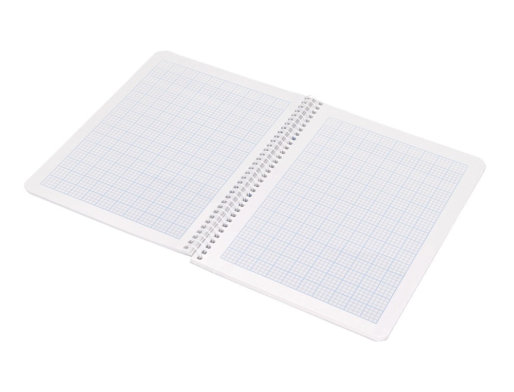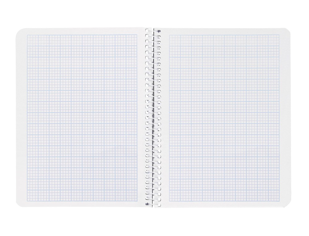 Tapa de cartoncillo de 800 g/m² con doble encolado, impresa y plastificada mate. Gran resistencia y rigidez. Papel de 75 g/m². Espiral nylonizada. Con margen. Coil-lock. Colores surtidos.