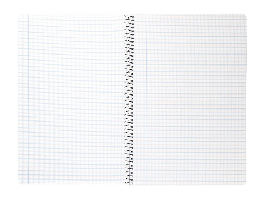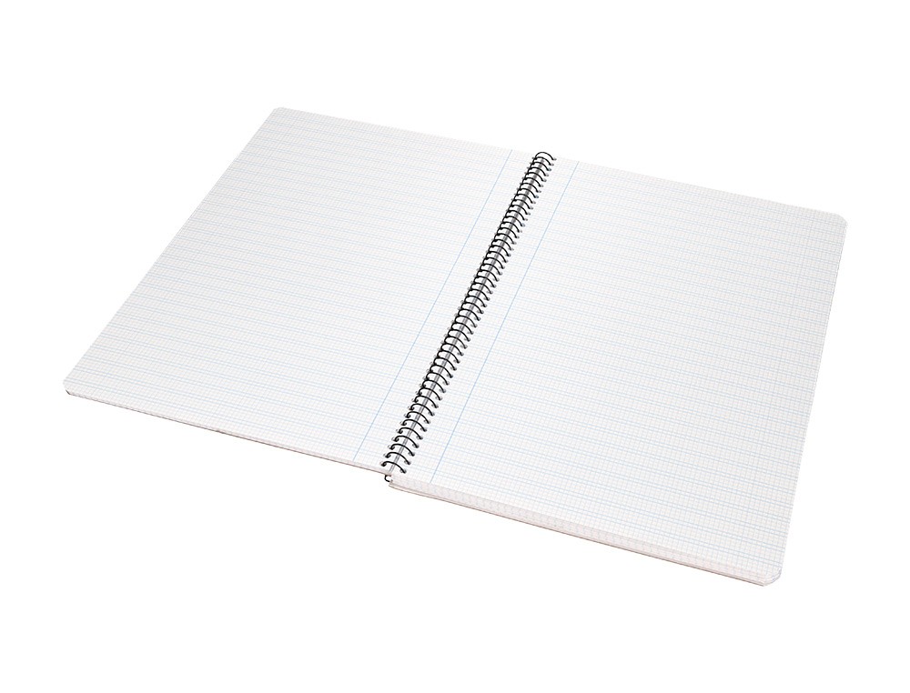 Tapa de plástico, diseño impreso en cartulina. Papel de 75 g/m² . Gran resistencia y rigidez. Cuadrícula con margen. Formato folio. Espiral nylonizada negra. Coil-lock. 5 colores surtidos.
