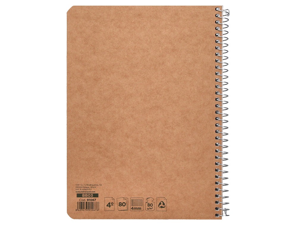 Tapa de cartoncillo fabricada en kraft de 400 g/m². Impresa. 80 hojas. Papel 100 % reciclado de 80 g/m². Espiral nylonizada plateada. Cuadrícula de 4 mm. Con margen. Coil-lock.