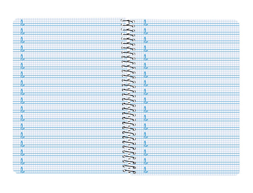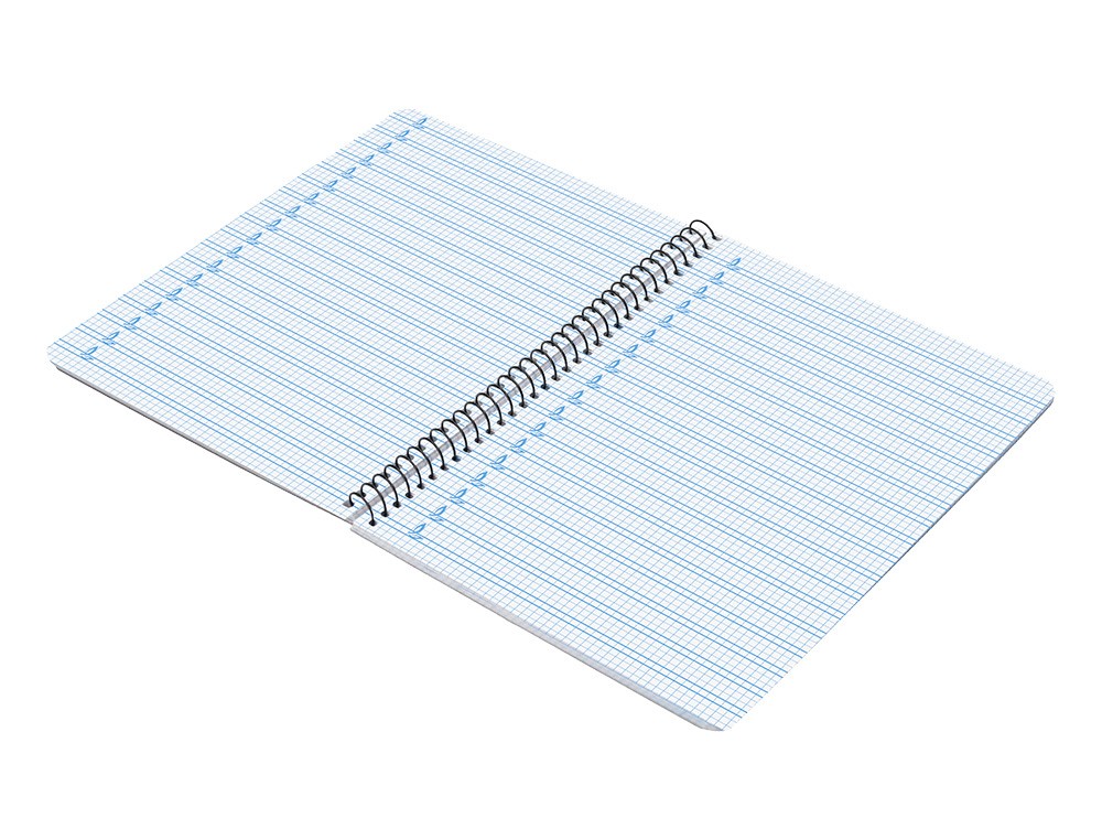 Tapa dura de cartoncillo de 80 g/m2 con doble encolado, impresa y plastificada. Gran resistencia y rigidez. Papel de 75 g/m2 . Cuadrícula con margen. 80 hojas. Espiral nylonizada negra. Coil-lock. 6 colores surtidos.