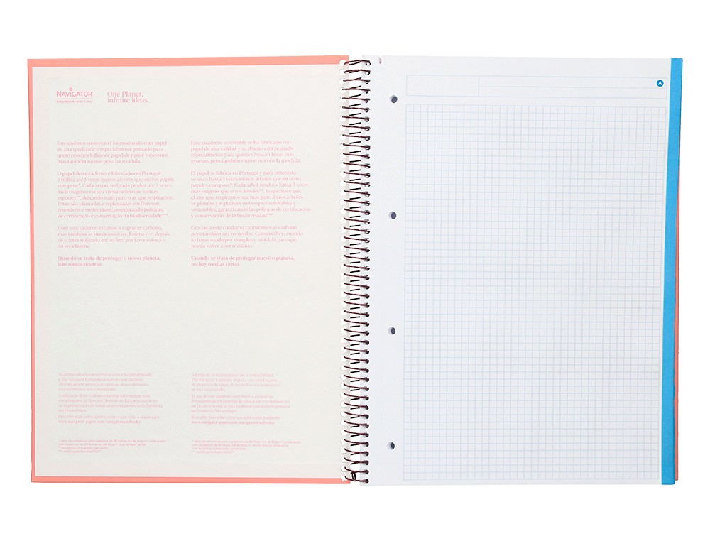 Cuaderno A4 microperforado de gran calidad, cuadro de 5mm con 5 bandas de color, 120 hojas de papel 80g/m2 con excelentes características, gran suavidad y blancura, además hace la escritura muy fluida. Tapa de cartón entrecolado de 1,5 mm de espesor. Tapa forrada a una cara con papel estucado mate extrasuave. Guarda interior impresa. Gran resistencia y rigidez. La tinta no traspasa. Espiral nylonizada de color. Coil-lock.