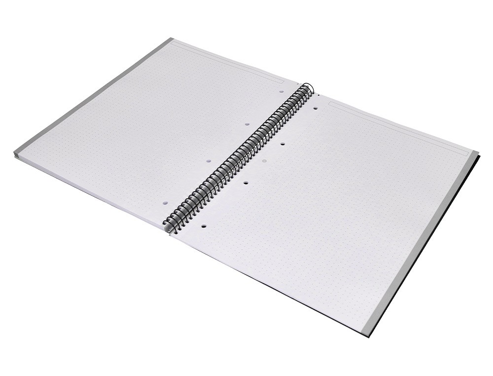 EL CUADERNO DE MÁS ALTA GAMA DEL MERCADO: EXCLUSIVO DISEÑO, CARACTERÍSTICAS INIGUALABLES, UN CUADERNO SIN PRECEDENTES QUE SE DISTINGUE POR LA SUAVIDAD Y BLANCURA DE SU PAPEL. TAPA DE CARTÓN ENTRECOLADO DE 1,5 MM DE ESPESOR, FORRADO A UNA CARA CON PAPEL ESTUCADO MATE EXTRASUAVE Y RESERVA DE BARNIZ UVI. GUARDA INTERIOR IMPRESA. 80 HOJAS DE GRAN RESISTENCIA Y RIGIDEZ. PAPEL EXTRABLANCO DE 90 G/M2, ULTRASUAVE QUE HACE LA ESCRITURA MUCHO MÁS FLUIDA. LA TINTA NO TRASPASA. BANDA DE COLOR. FORMATO DIN A4. MICROPERFORADO.ESPIRAL NYLONIZADA DE COLORES. COIL-LOCK. COLOR NEGRO. INTERIOR IMPRESO EN SUAVES PUNTOS GRISES EQUIDISTANTES 5MM ENTRE SI QUE PERMITEN SER UNA PERFECTA GUIA SIN DESTACAR. IDEAL PARA HACER BOCETOS, DIBUJAR, TOMAR APUNTES O HACER GRAFICOS.
