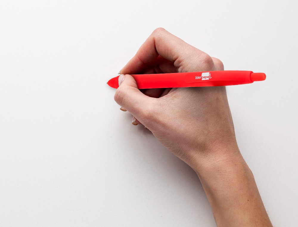 Bolígrafo retráctil con cuerpo efecto goma. Tinta a base de aceite. Cuerpo del color de la tinta. Punta media. Trazo de 1 mm.