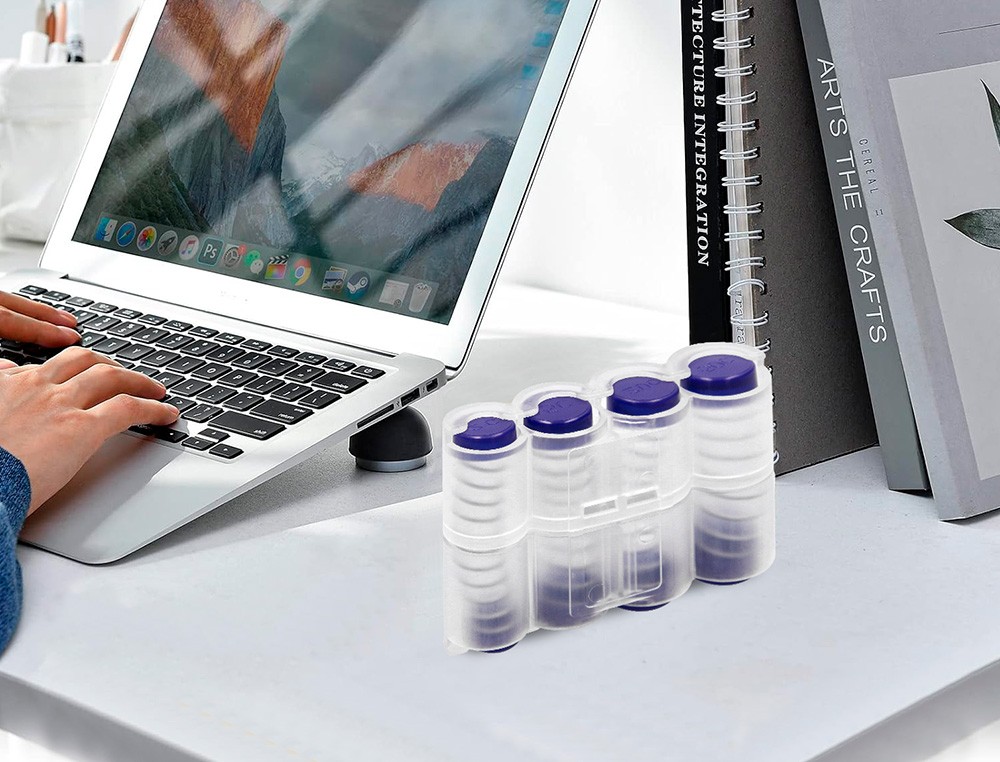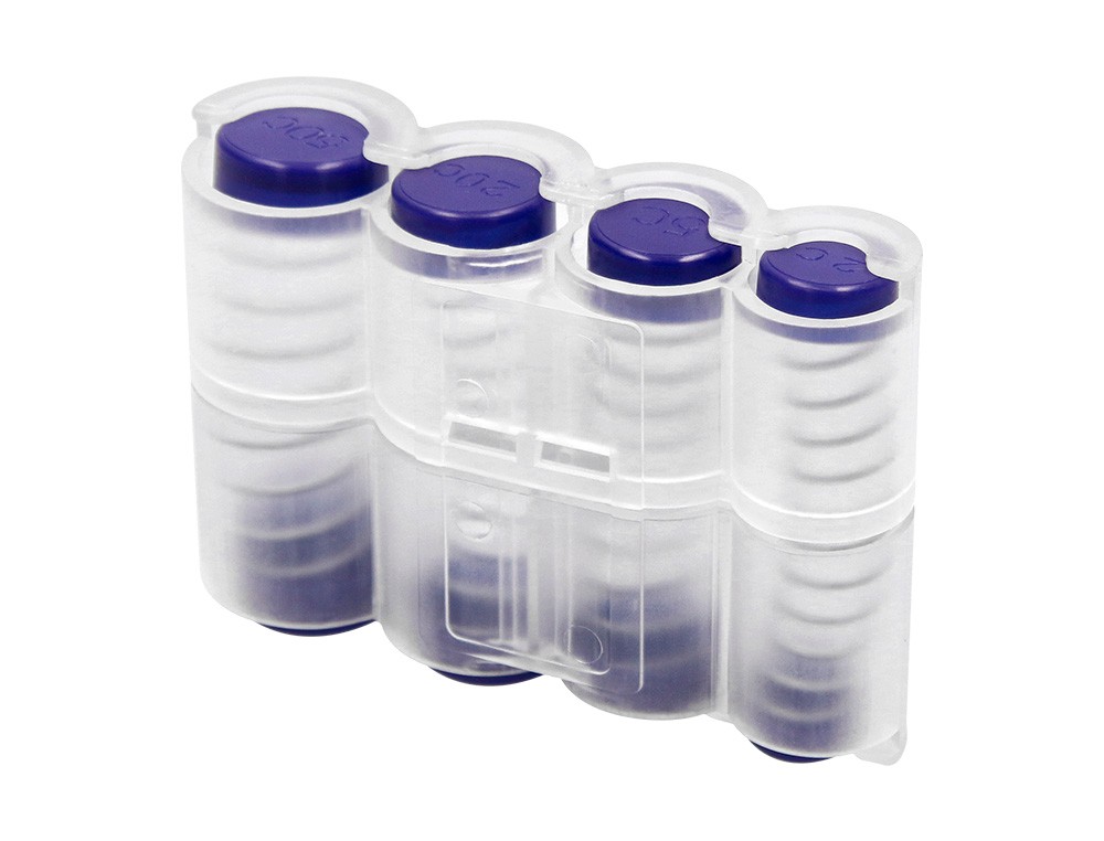Portamonedas con muelle válido para las 8 fracciones de euro (monedas de 1, 2, 5, 10, 20 y 50 céntimos, 1 y 2 ). Ideal para taxistas, kioscos de prensa, kioscos de la ONCE, camareros, aparcacoches, etc. Color transparente y azul. Medidas: 75 x 105 x 32 mm.