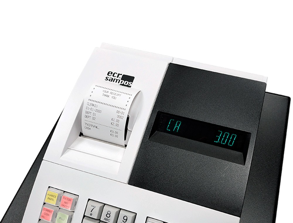 Registradora ecr sampos er-057 s blanca 14 departamentos display vfd antireflejos conforme