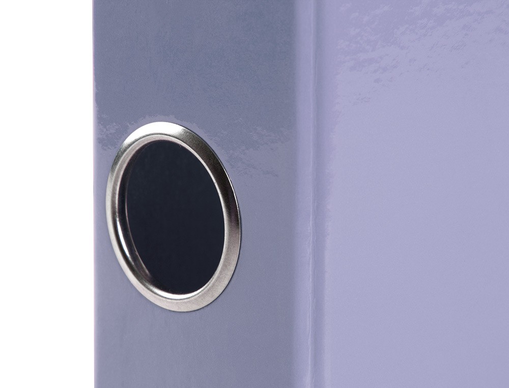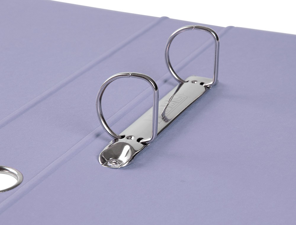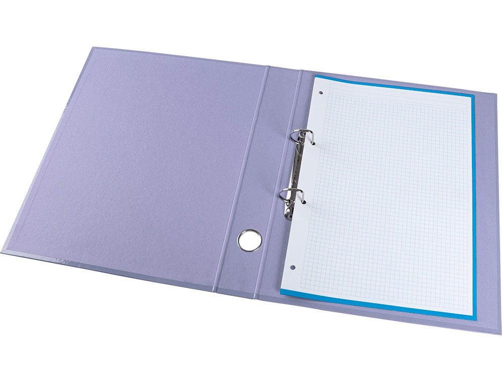 Carpeta fabricada en cartón forrado de 1,75 mm de espesor. Papel estucado brillo de 115 g/m². Ollao y tarjetero. Con 2 anillas mixtas de 25 mm. Formato DIN A4. Ancho de lomo: 45 mm. Colores pastel.