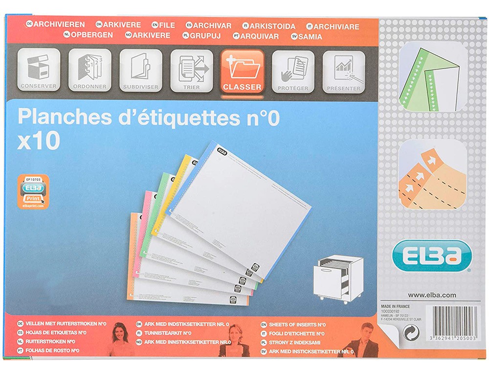 Etiquetas pretroqueladas con bordes en azul, naranja, verde y amarillo. Para carpetas colgantes de visor superior de 80 mm de largo. Personalizables en www.elbaprint.es. Paquetes de 10 hojas de 25 etiquetas.