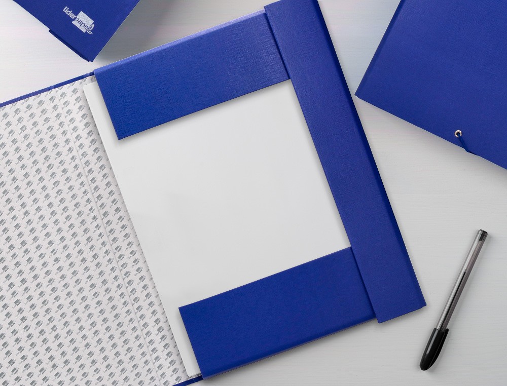 Carpeta para proyectos fabricada en cartón entrecolado de 1,9 mm de espesor, forrado gofrado tela de PVC y guarda interior. Con etiqueta identificativa para pegar en el lomo. Cierre con elástico. Tamaño folio. Medidas: 250 x 350 mm.