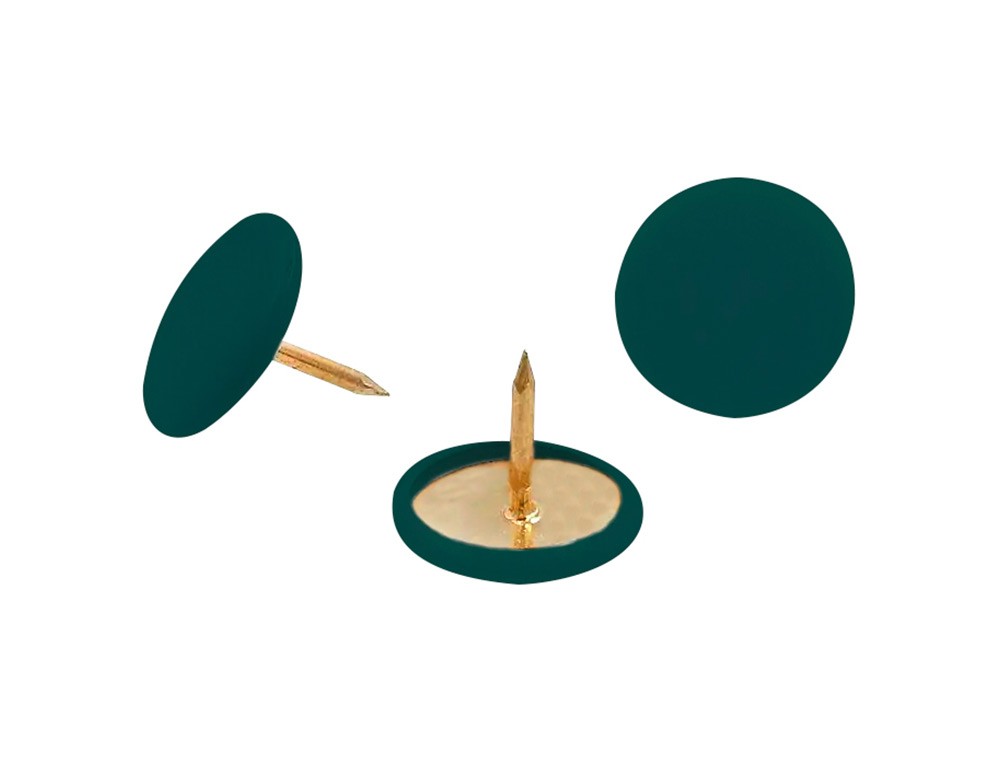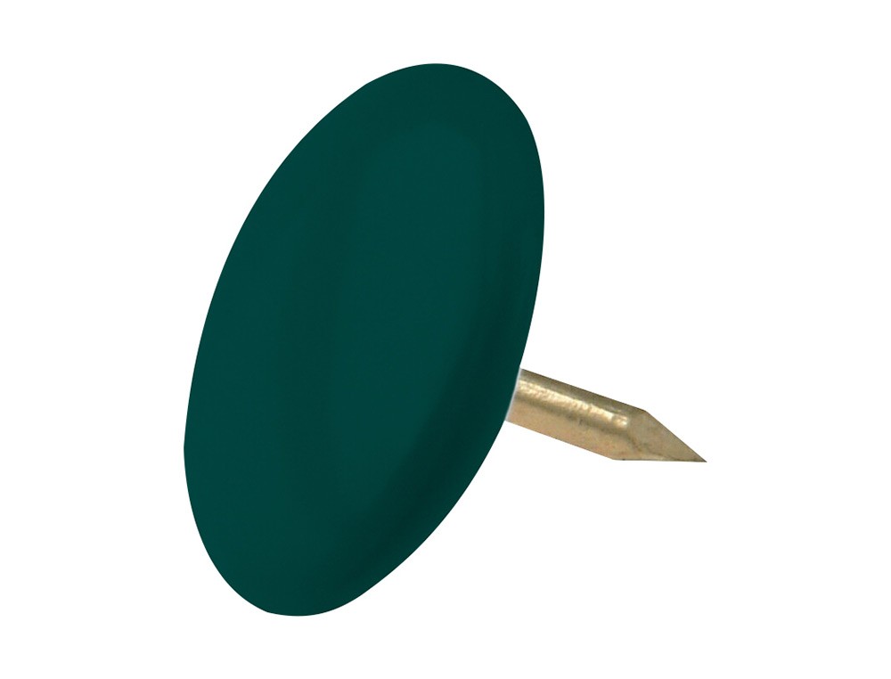 Chinchetas recubiertas de plástico con cabeza plana. Diámetro de la cabeza: 9 mm. Longitud 8 mm. Color verde oscuro. Caja de 100 unidades.