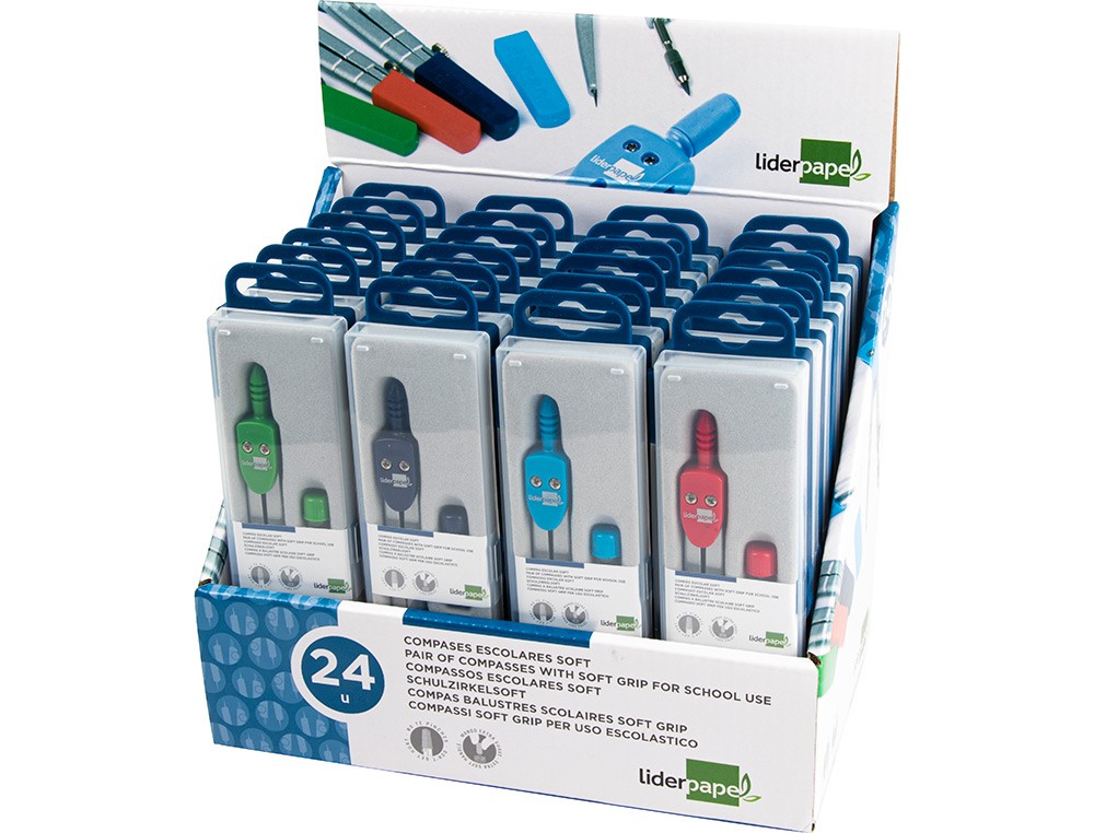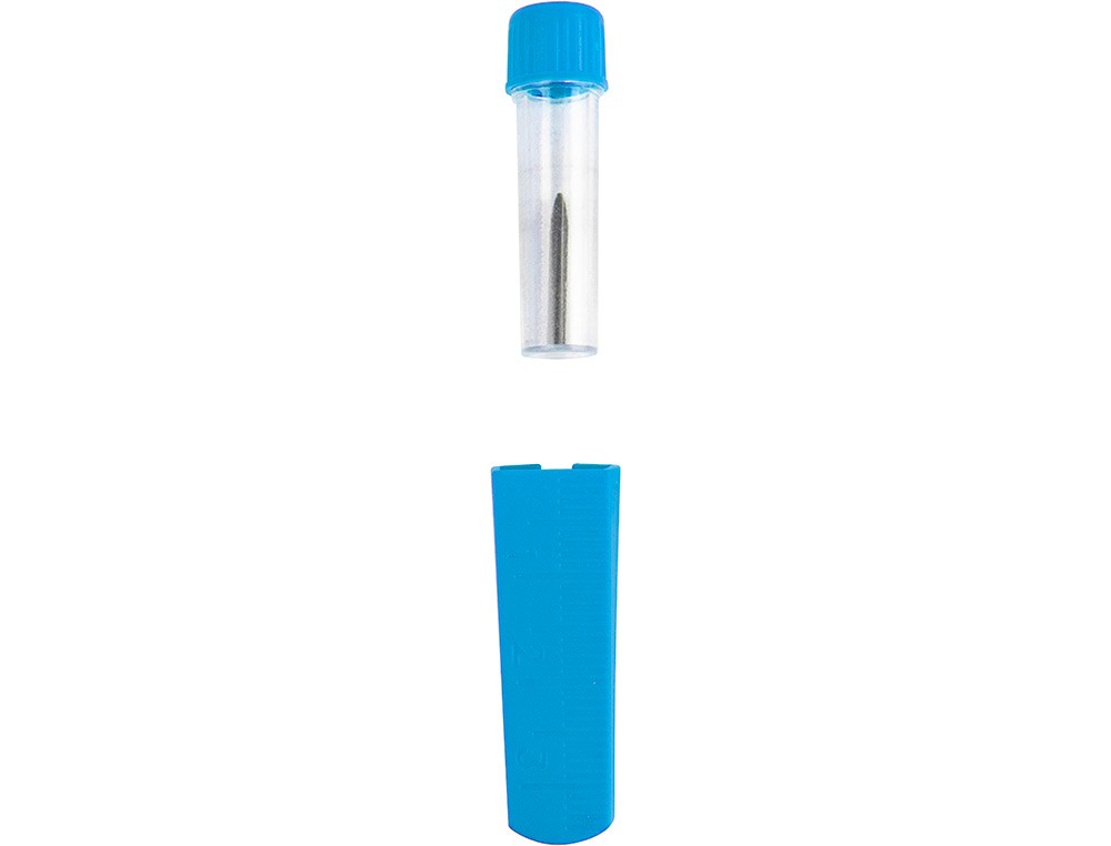 Mango extrasuave. Con protector de punta para evitar pinchazos y mina de 2 mm de repuesto. Se presenta en estuche de plástico transparente y de color. Colores surtidos: azul, celeste, rojo, negro y verde. Longitud: 12 cm. Circunferencia: 36 cm.