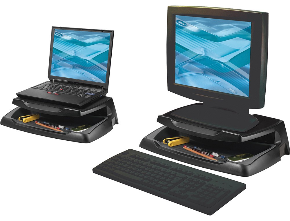 Duradero, material resistente a los arañazos. Plataforma acolchada antideslizamientos. Plataforma elevada. Superficie de 370 x 235 mm. Apto para portátiles con monitores 15 y 17 . Soporta hasta 5 kg. Medidas: 465 x 120 x 345 mm. Peso: 2 kg.