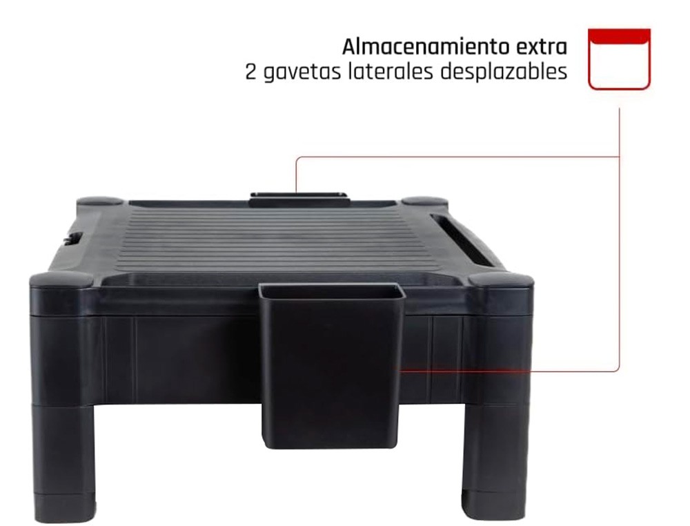 El soporte para monitor/impresora Q-Connect ofrece una solución versátil yeficiente para organizar su espacio de trabajo. Con un diseño ajustable e n dos alturas (10,3 y 13,3 cm), este soporte proporciona una plataforma resistente y antideslizante, capaz de sostener monitores o impresoras de hasta 20 kg y de hasta 22 pulgadas. Equipado con un cajón que cuenta con dos divisiones extraíbles para crear tres compartimentos pequeños o adaptarse a papeles tamaño A4, y dos organizadores laterales móviles para almacenar pequeños productos de oficina, este soporte maximiza la eficiencia y la comodidad en su entorno laboral. Su construcción de HIPS (High Impact Polystyreney) garantiza durabilidad y resistencia, mientras que su diseño elegangante en color negro complementa cualquier espacio de trabajo con estilo yfuncionalidad.