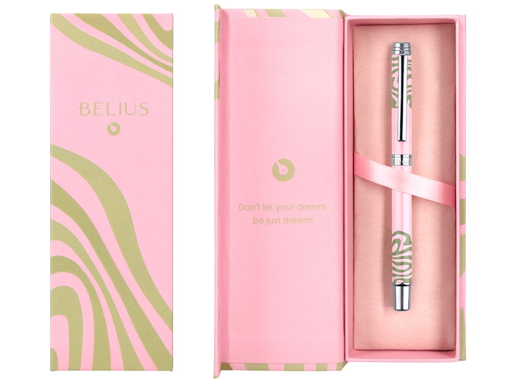 Roller belius ink dreams aluminio color rosa y verde matcha plateado frase interior tinta negra caja de diseño
