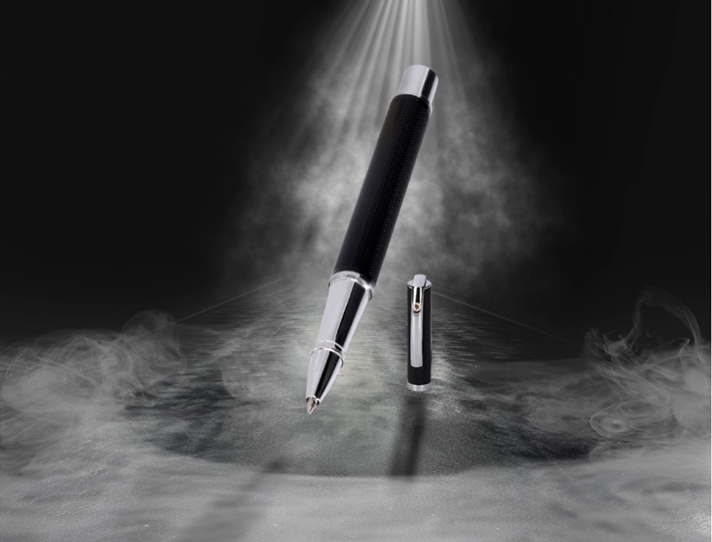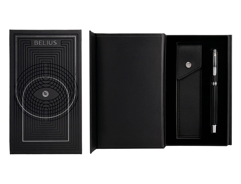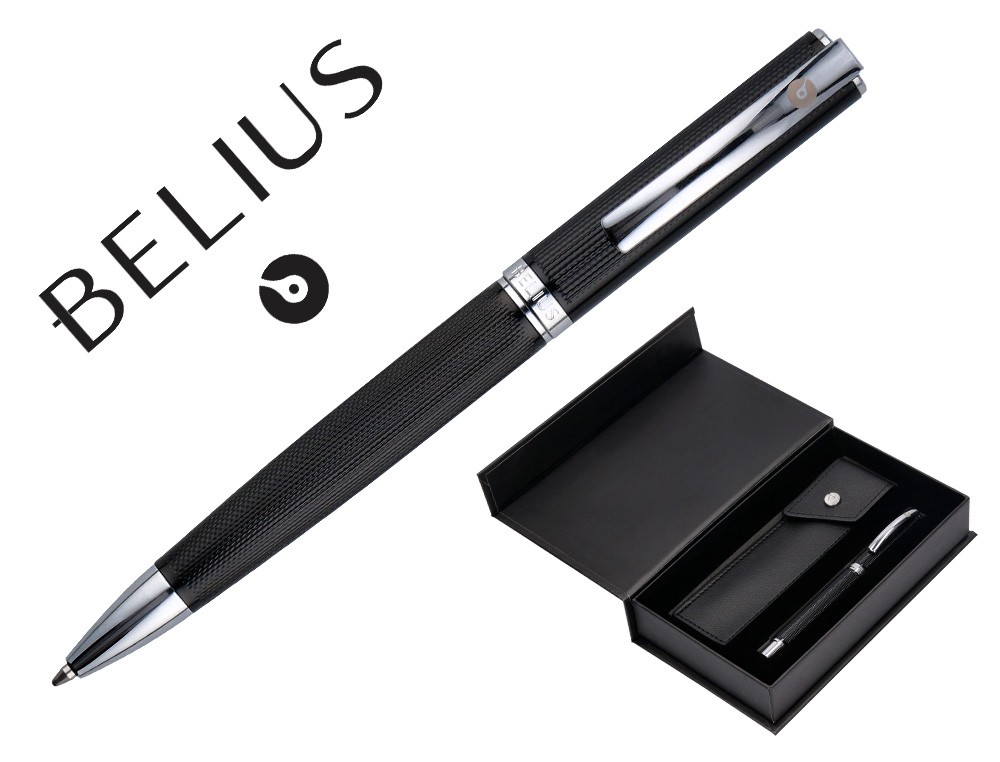 Boligrafo y estuche belius turbo aluminio textura punteada negro y plateado tinta azul caja de diseño