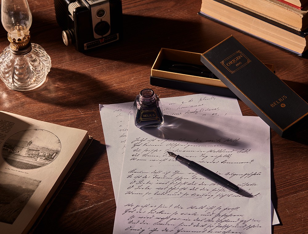 Boligrafo belius origen 1995 aluminio textura cepillada color negro tinta azul caja de diseño