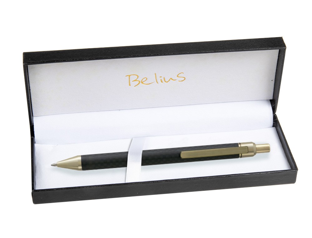 Boligrafo belius potsdam negro y dorado cuerpo fibra carbon tinta gel azul en estuche