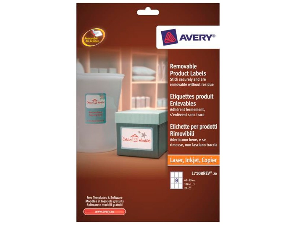 Etiquetas adhesivas blancas removibles. Percfeta para un etiquetado temporal. El adhesivo no deja residuo de pegamento sobre la superficie. Ideales sobre productos y precios. Compatibles con impresoras ink-jet, láser y fotocopiadoras. Hechas de material proveniente de bosque certificado FSC. Caja de 20 hojas. Se puede utilizar el software crea e imprime gratuito de Avery para realizar el diseño de las etiquetas con pocos clics.
