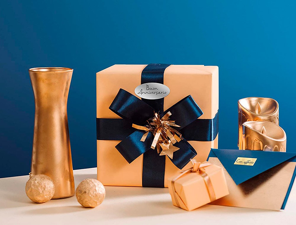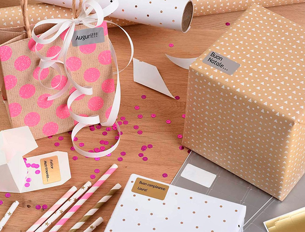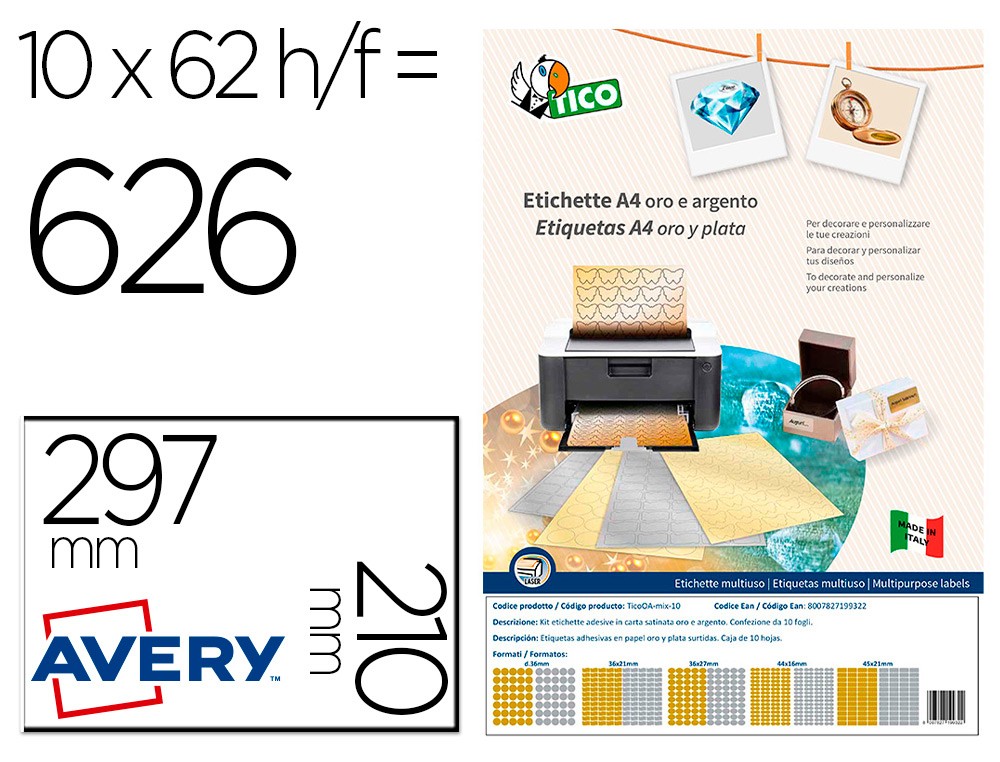 Etiqueta adhesiva tico papel satinado oro / plata laser medidas surtidas caja de 626 unidades