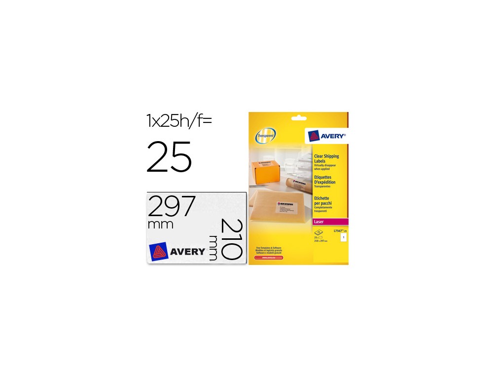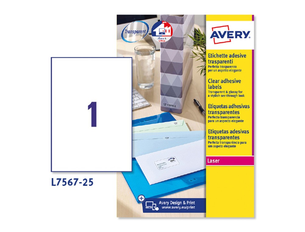 Etiquetas adhesivas de poliéster brillantes transparentes. Perfectas para ser aplicadas sobre vidrio, superficies pulidas, plástico y metal. Resisten al aceite, a la suciedad y a los desgarres, garantizadas para durar por largo tiempo.Compatible con impresora Láser y HP índigo. Se puede utilizar el software crea e imprime gratuito de Avery para realizar el diseño de las etiquetas con pocos clics. Caja de 25 hojas.