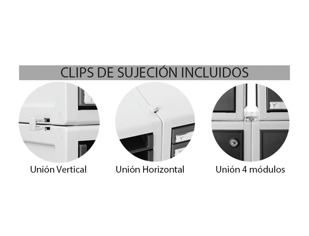 Módulos de cajones inyectados en poliestireno de gran calidad. Ligeros, resistentes y fáciles de montar y apilar. Sistema de unión mediante clips que permiten formar todo tipo de estructuras tanto en vertical como en horizontal. Color gris. Incluye espacio para la etiqueta.