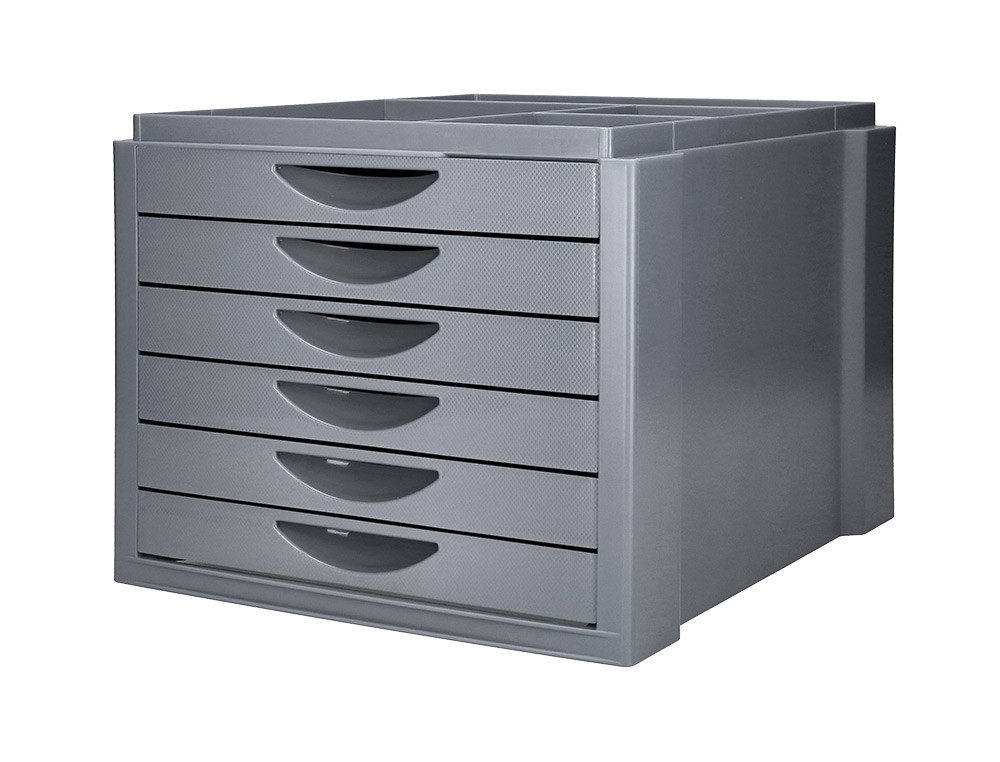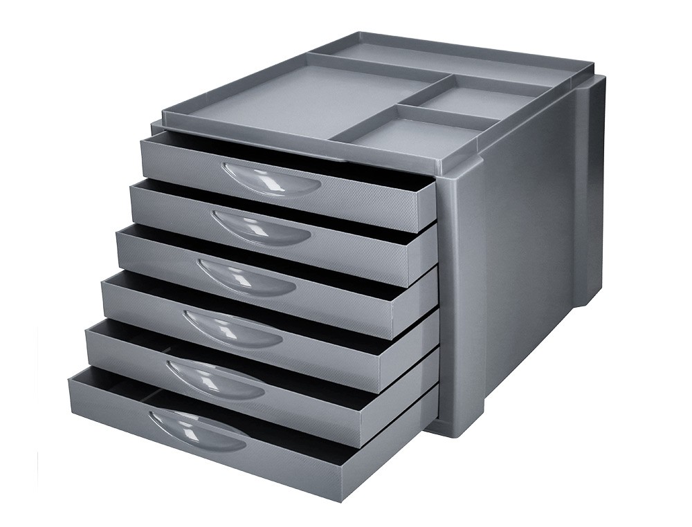 Módulo de sobremesa con carcasa gris y 6 cajones. Fabricado en poliestireno de gran calidad y resistencia. Apilable. Cajones con tope de seguridad y suave deslizamiento. Válido para formatos DIN A4, folio y subcarpetas. Incluye bandeja organizadora con 4 compartimentos en la parte superior para tener siempre a mano los accesorios de oficina. Medidas: 350 x 255 x 280 mm.