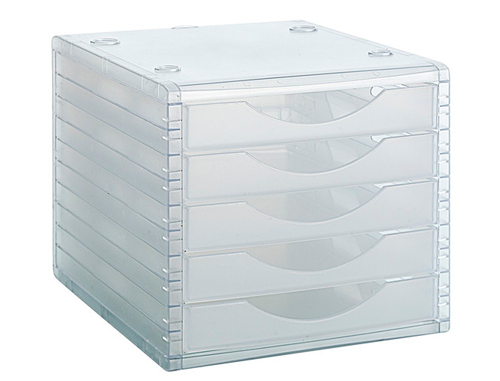 Módulo de 5 cajones. Carcasa: color cristal translúcido. Medidas interiores de cajones: 234 x 38 x 323 mm. Apilamiento perfecto con la simple colocación de un módulo de cajones sobre otro. Cajones con tope de seguridad y suave deslizamiento. Válidos para formatos DIN A4, folio y subcarpetas. Color transparente. Medidas: 270 x 340 x 260 mm.