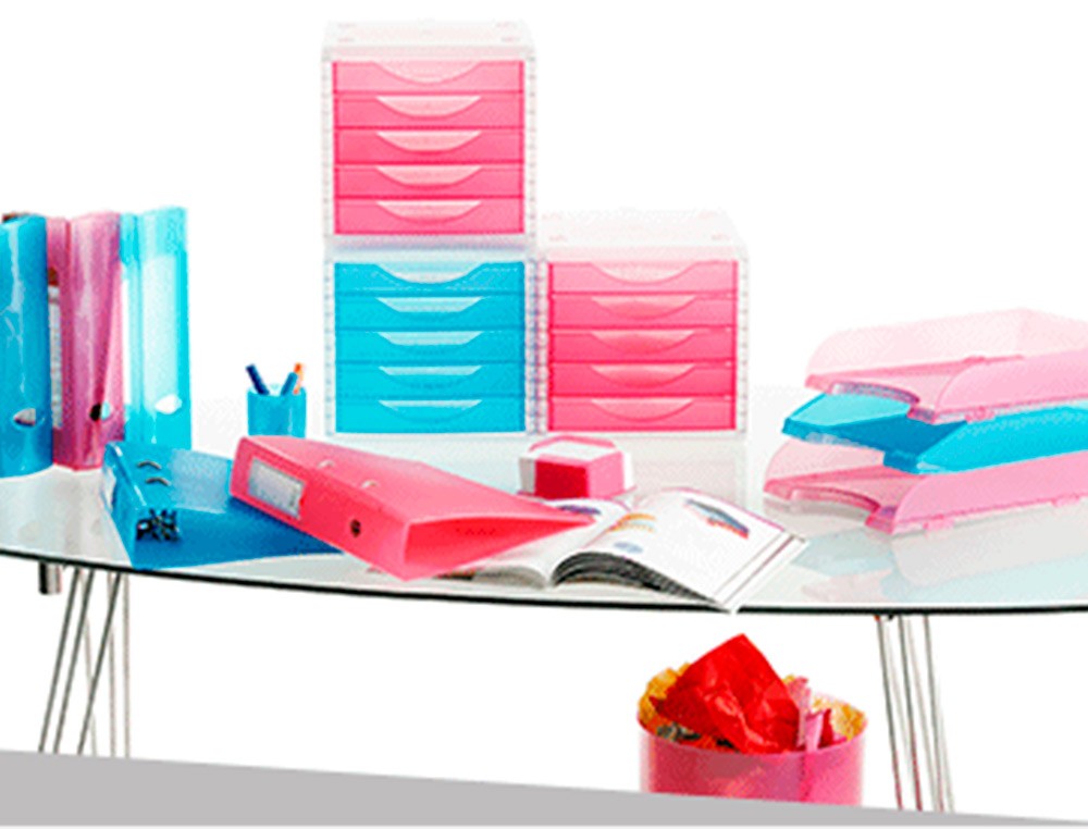 Módulos con carcasa transparente y 5 cajones en una gama de colores traslúcidos. Apilables con la simple colocación de un módulo sobre otro. Cajones con tope de seguridad y suave deslizamiento. Válido para formatos DIN A4, folio y subcarpetas. Medidas: 255 x 270 x 340 mm.