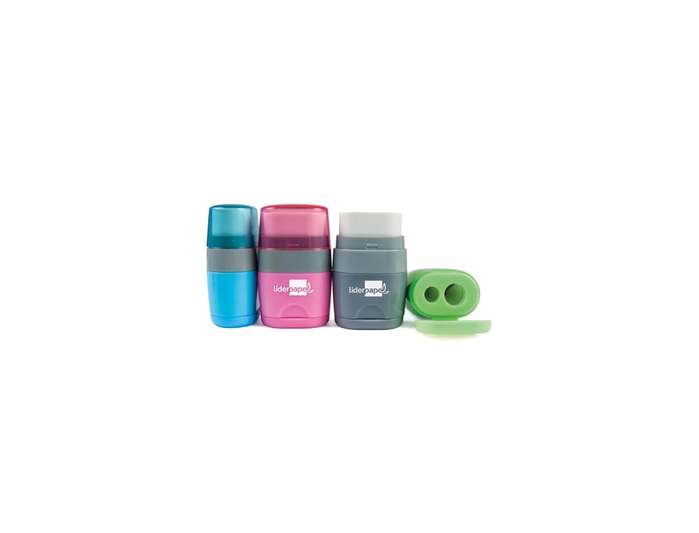 Sacapuntas con goma. Con depósito. Sin PVC. Longitud: 61 mm. Ancho: 34 mm. Grosor: 23 mm. Colores surtidos. Dos usos.