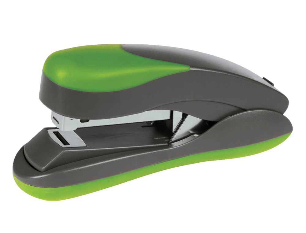 Grapadora de plástico verde y gris con mecanismo metálico. Usa grapas de 22/6, 24/6 y 26/6. Longitud del grapado al borde de la hoja: 55 mm. Carga 3 peines (150 grapas). Grapado cerrado plano. Superficie verde de caucho antideslizante. Longitud de la base: 147 mm. Medidas: 43 x 68 x 147 mm.