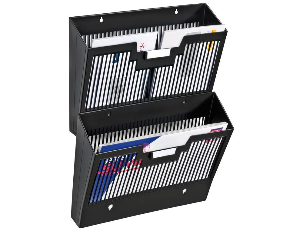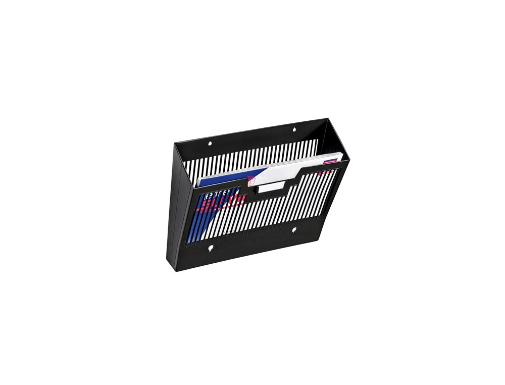 Expositor de rejilla de gran capacidad para documentos DIN A4 y folio. Acoplable en vertical. Con portaetiquetas central. Apertura ancha para fácil acceso. Equipado con un soporte de etiqueta central, para poder unir las cestas en grupos o por separado. Fabricado en poliestireno reciclable de alto impacto. Color negro. Medidas: 25,7 x 36 x 9,5 cm.