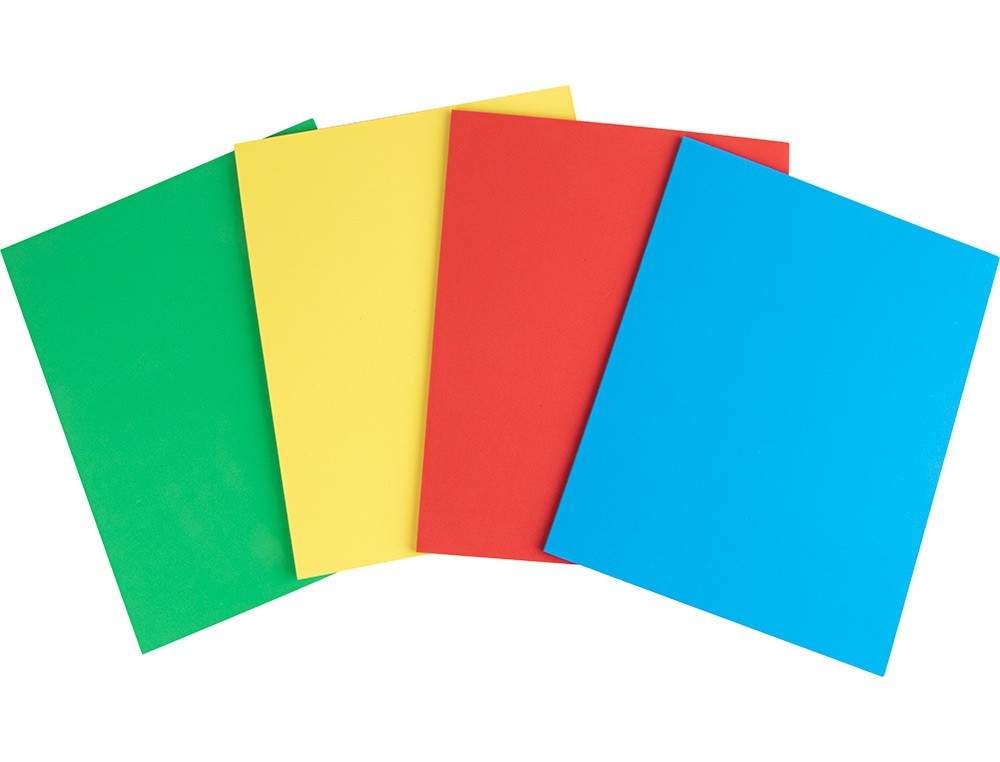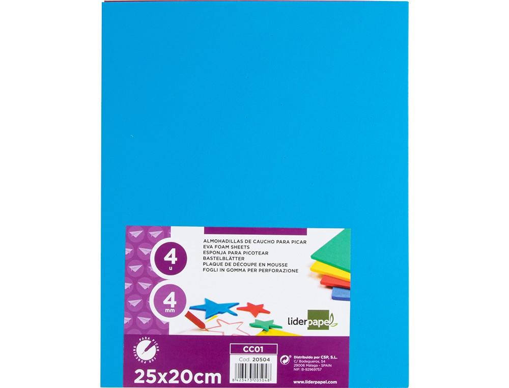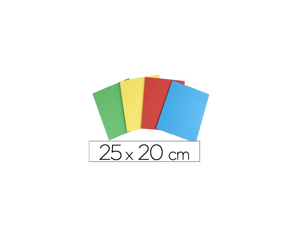 Ideal para uso escolar y manualidades. Indicado para la técnica del picado. Colores surtidos (amarillo, azul, rojo y verde). Grosor de 4 mm. Medidas: 250 x 200 mm.