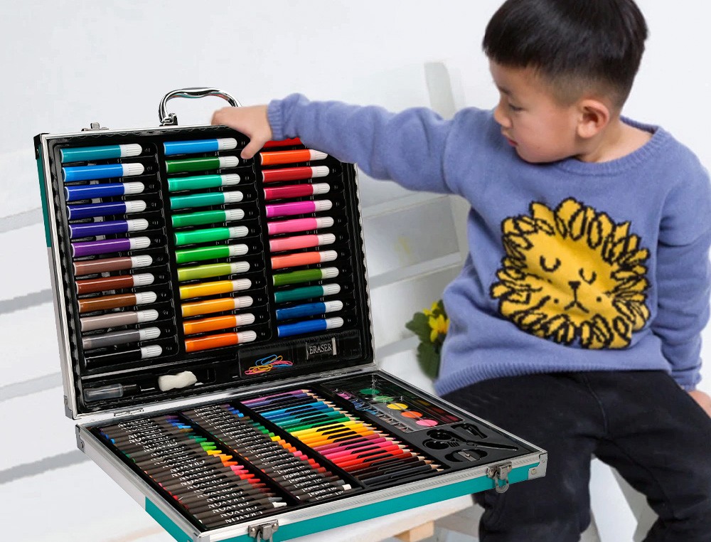 Conjunto de dibujo y coloración en fantástico estuche de aluminio: 150 elementos esenciales creativos para dibujar, colorear y hacer en cualquier momento y en cualquier lugar. Contenido: 36 rotuladores de colores, 24 lápices de colores, 24 ceras de colores, 24 ceras blandas de colores, 12 colores de acuarela, 20 clips, 1 lápiz, 1 pincel, 1 pegamento, 1 goma, 1 sacapuntas, 1 cola blanca, 1 tijera, 1 regla, 1 paleta y 1 esponja. Medidas: 37,8 x 29,7 x 4,6 cm.