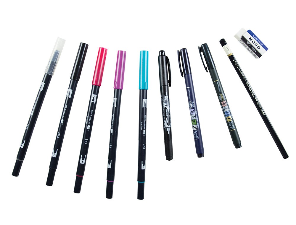 Set que contiene todo el material necesario para el hand lettering avanzado. Incluye manual de instrucciones con recomendaciones y trucos para mezclar colores. Productos incluidos: 4 rotuladores ABT Dual Brush con punta flexible ancha para letras grandes y punta fina para detalles. Colores: negro (ABT-N15), deep magenta (ABT-685), cherry (ABT-815) y sea blue (ABT-373). Blender Pen incoloro (ABT-N00) para suavizar y mezclar colores. Lápiz degrafito de alta calidad MONO 100 a prueba de borrones. Grado de dureza 3H (muy duro). Rotulador de caligrafía Fudenosuke en dos versiones: punta fi na pincel firme grado de dureza 1 (duro) y punta fina pincel blanda flexible grado de dureza 2. Tinta color negro. Rotulador permanente MONO twin cocon doble punta: fina y ancha. Tinta color negro. Goma de borrar MONO XS para un borrado limpio y exacto.