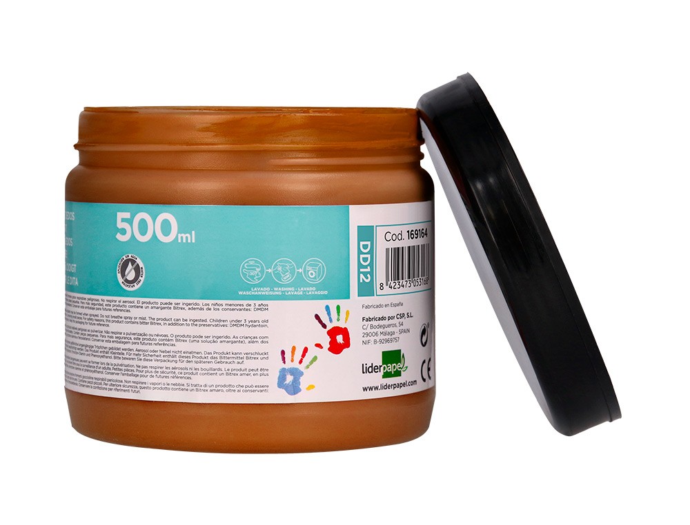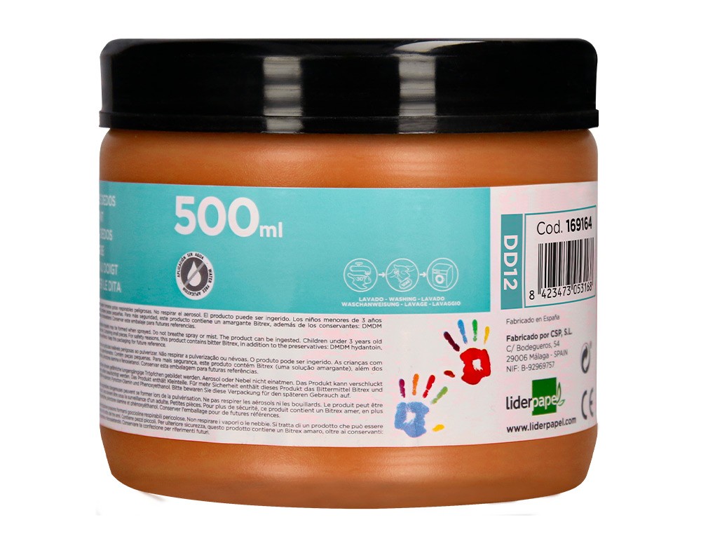 Pintura dedos Liderpapel tarrina de 500 ml color. Pintura dedos en base agua, buena viscosidad antigoteo. Se aplica con los dedos sobre cualquier tipo de papel. Aplicación directa sin necesidad de agua. Fácil lavado con agua y jabón en la mayoría de los tejidos. Fabricación bajo normativa europea en 71-3. Sin gluten y libre de los principales agentes causantes de alergias. Tarrina 500 cc. Color marrón.