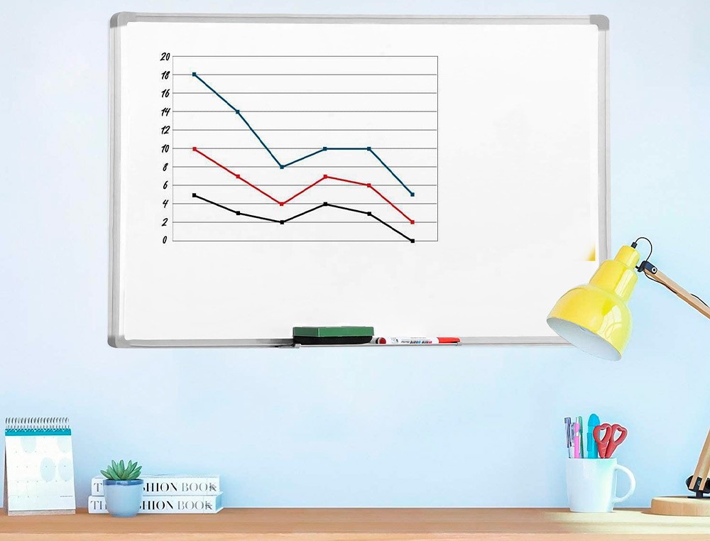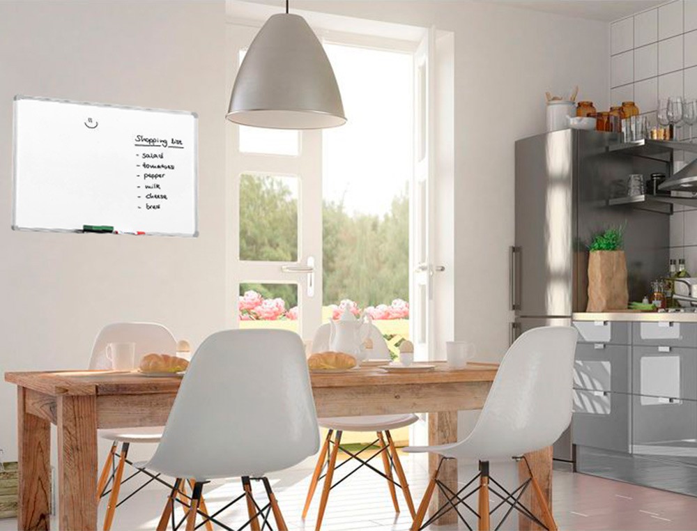Superficie lisa. Con marco de aluminio. Utilizar sólo rotuladores especiales para pizarra blanca. Bandeja incluida. Adaptable a formato vertical. Provista de accesorios de fijación a la pared.