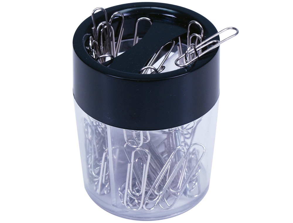 Forma redonda. Imantado. Depósito transparente con 2 departamentos. Ideal para separar clips de distintos tamaños, color, forma Contiene clips. Medidas: Ø 60,4 x 72,5 mm.