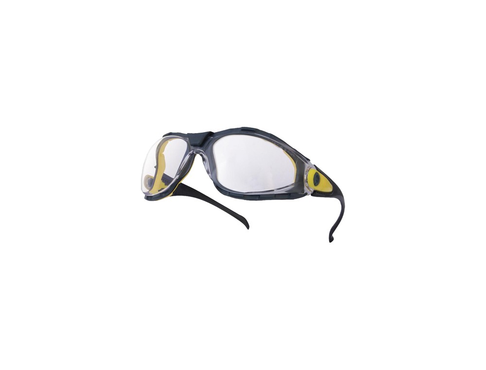 Gafas de policarbonato monobloque. Puente nasal de policarbonato integrado. Patillas de nylon abatibles. Protecciones laterales. Antivaho, antirrayaduras y con protección UV400. Peso: 36 g.