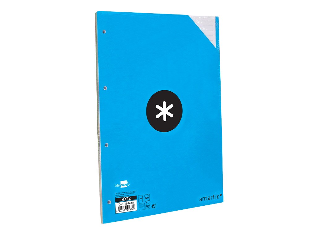 Recambio A4 Antartik. 100 hojas. Rayado horizontal. Bandas de 5 colores con 4 taladros. El recambio con exclusivo diseño, características de alta gama, un recambio sin precedentes que se distingue por la suavidad y blancura de su papel. Papel extrablanco de 100 g/m2, ultrasuave que hace la escritura mucho más fluida. La tinta no traspasa. Ideal como complemento para tu carpeta Antartik.
