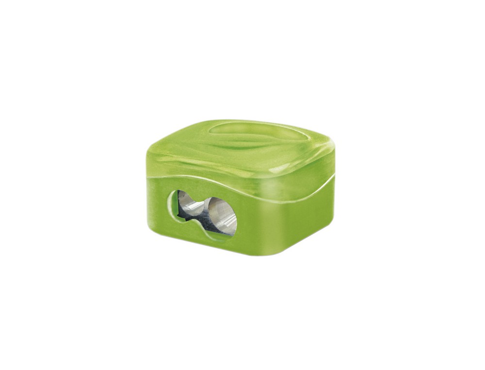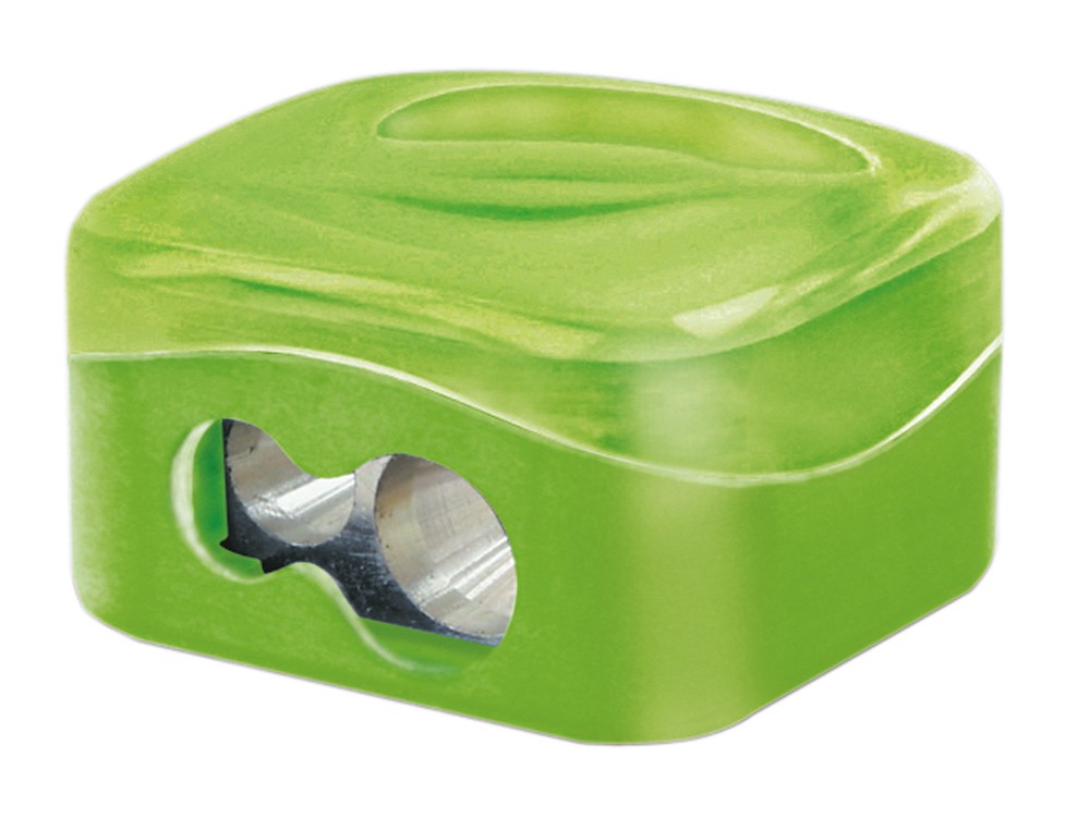 Sacapuntas metálico y cobertura de plástico. Con depósito plano ideal para llevar en el portatodo. Con tapa, que lo hace más seguro para los niños. Colores surtidos. Dos usos.