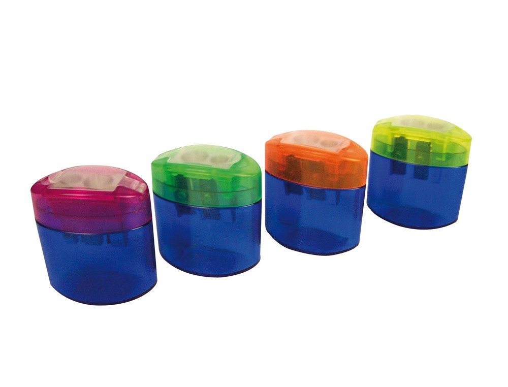 Sacapuntas metálico y cobertura de plástico. Con depósito para las virutas. Con tapa, que lo hace más seguro para los niños. Colores surtidos traslúcidos. Dos usos.