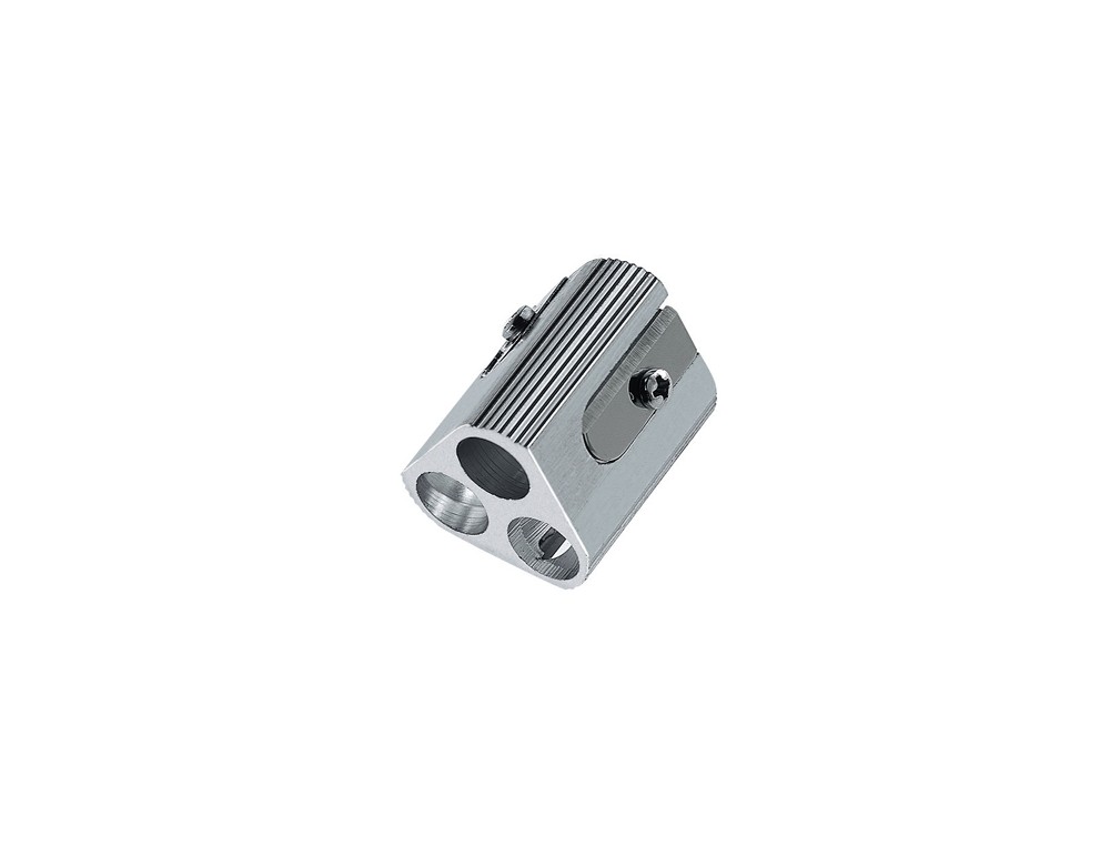 Sacapuntas de magnesio en forma prisma triangular y cantos redondeados. De gran robustez y resistencia. Tres usos que permiten tres formas distintas de afilar el lápiz.