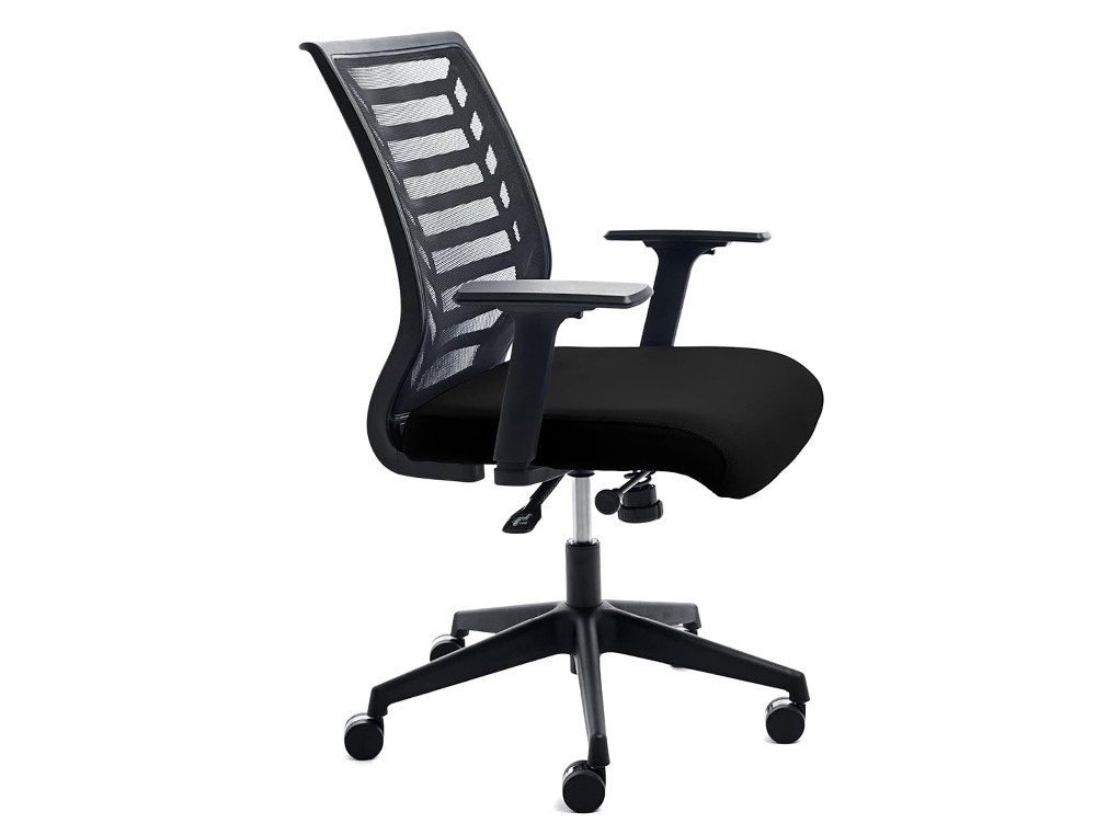 Silla de oficina operativa con asiento tapizado con tela ignífuga sobre interior de espuma inyectada, respaldo de malla negra sobre estructura inyectada de polímero técnico. Base en polímero técnico y robusto mecanismo basculante para un uso diario. Altura de la silla: 91-100 cm. Altura del respaldo: 50 cm. Altura del asiento: 43-52 cm. Ancho del asiento: 47 cm. Profundidad del asiento: 47 cm. Brazos: regulables en altura 8 cm. Ruedas: nylon 5 cm Ø. Horas de uso: 8 horas. Peso de la silla: 14 kg. Peso soportado: 125 kg.