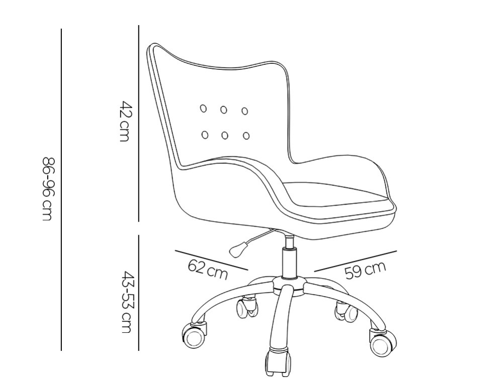 Esta silla de escritorio combina un cuidado diseño en gris con un acabado moderno y sofisticado, fabricada con un tejido de calidad que proporciona comodidad y garantiza durabilidad. Cuenta con un mecanismo de ajuste que permite regular fácilmente la altura del asiento para adaptarse a las necesidades individuales. El pistón de gas cromado de 100 mm ofrece un ajuste suave y preciso. La base cromada que asegura resistencia y estabilidad de la silla en todo momento. Equipada con ruedas premium, ofrece una movilidad suave y silenciosa, permitiéndote desplazarte sin esfuerzo por tu espacio de trabajo. Las ruedas están especialmente diseñadas con un recubrimiento de nylon que evita arañazos y protege el parqué u otras superficies delicadas. Con unas dimensiones de ancho 59 cm x profundidad 62 cm x altura 86-96 cm, esta silla es perfecta para crear un espacio de trabajo funcional y estéticamente atractivo.