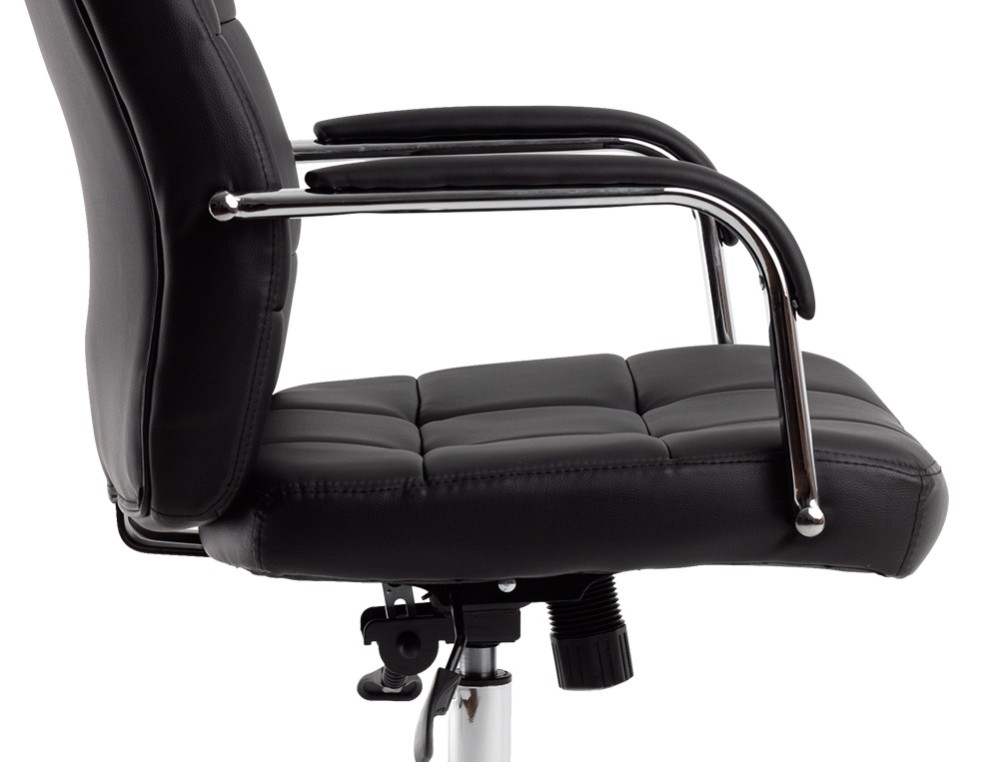 La elección perfecta para aquellos que buscan una combinación de diseño elegante y confort. Elegante silla acolchada de simil piel en color negro, diseñada para combinar estilo y comodidad. El acolchado del asiento y el respaldo están meticulosamente diseñados con hundimientos que forman atractivas figuras cuadradas, creando un aspecto moderno y sofisticado que brindan un mayor nivel de comodidad y soporte para la espalda. Además, está equipada con un mecanismo multifuncional que permite ajustar la altura y la inclinación de la silla para adaptarse a tus preferencias y necesidades. El cilindro de gas cromado de 100 mm permite un ajuste suave y preciso de la altura de la silla. Los reposabrazos cromados complementan el diseño de lasilla, aportando un toque de elegancia. Están revestidos de simil piel, p roporcionando una sensación suave y cómoda al apoyar los brazos. La silla cuenta con una resistente base cromada que garantiza estabilidad y durabilidad a largo plazo. Además, está equip