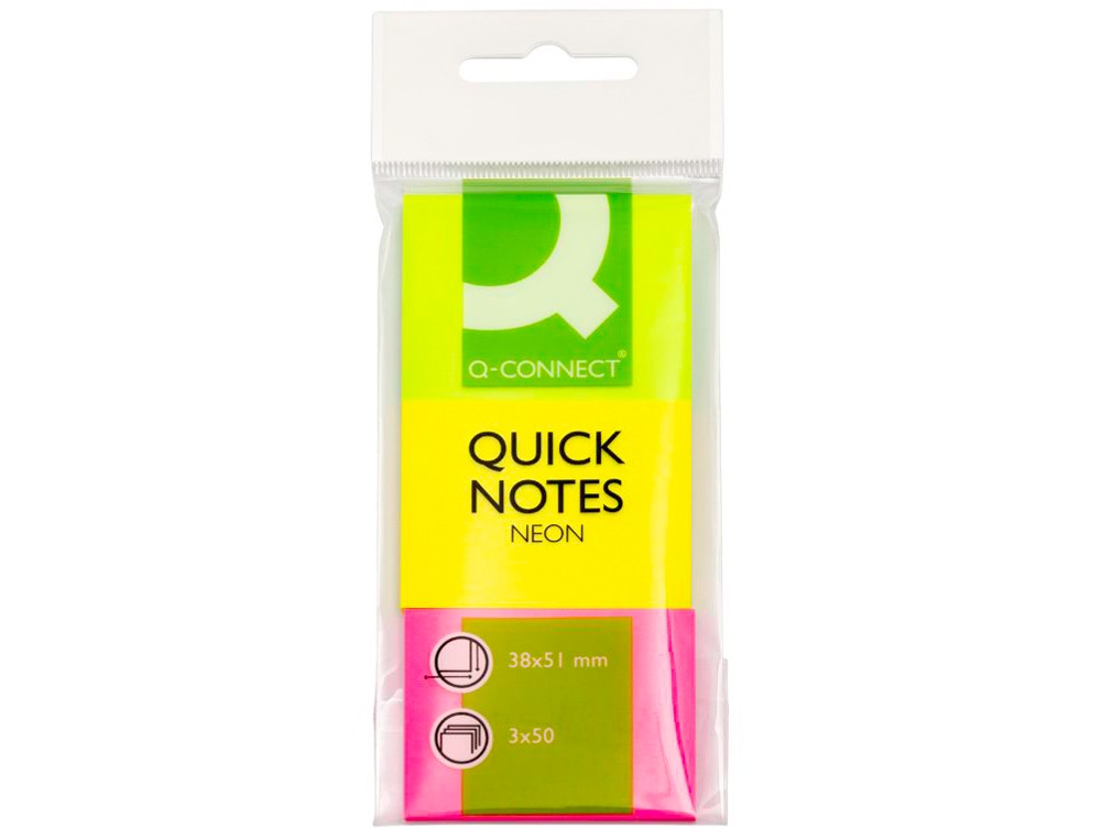 Bloc de notas adhesivas quita y pon q-connect 38x51 mm neon pack de 3 unidades con 50 hojas por color