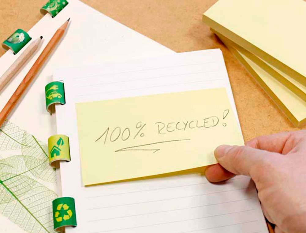 Fabricadas con papel 100% reciclado. Muy útiles para recordar información.Colores pasteles. Medidas: 76 x 127 mm. Bloc de 100 hojas. Producto Ecoló gico libre de plástico.
